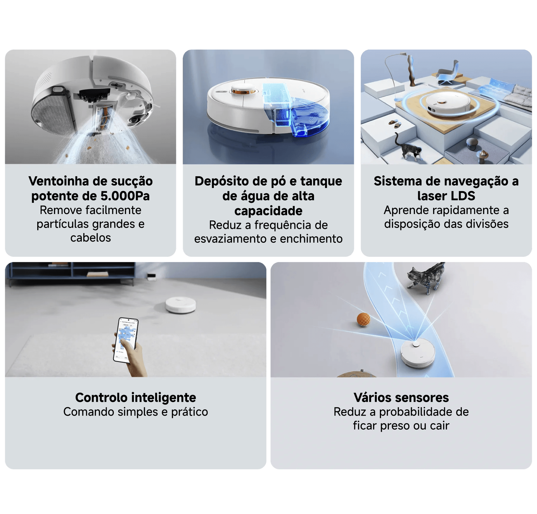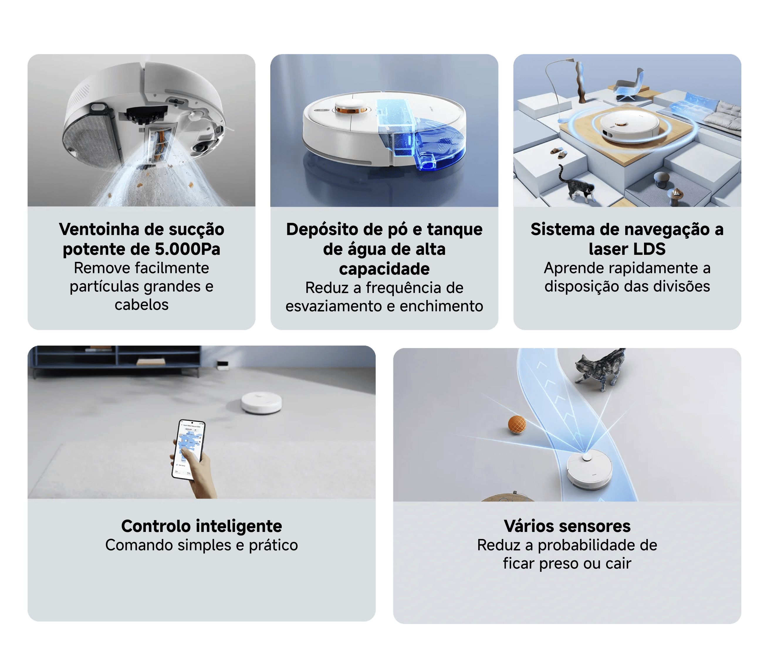 Navegação a laser LDS para uma cobertura de limpeza superior Ventoinha de sucção potente de 5 000 Pa Depósito de pó e tanque de água de elevada capacidade Vários sensores integrados Controlo inteligente
