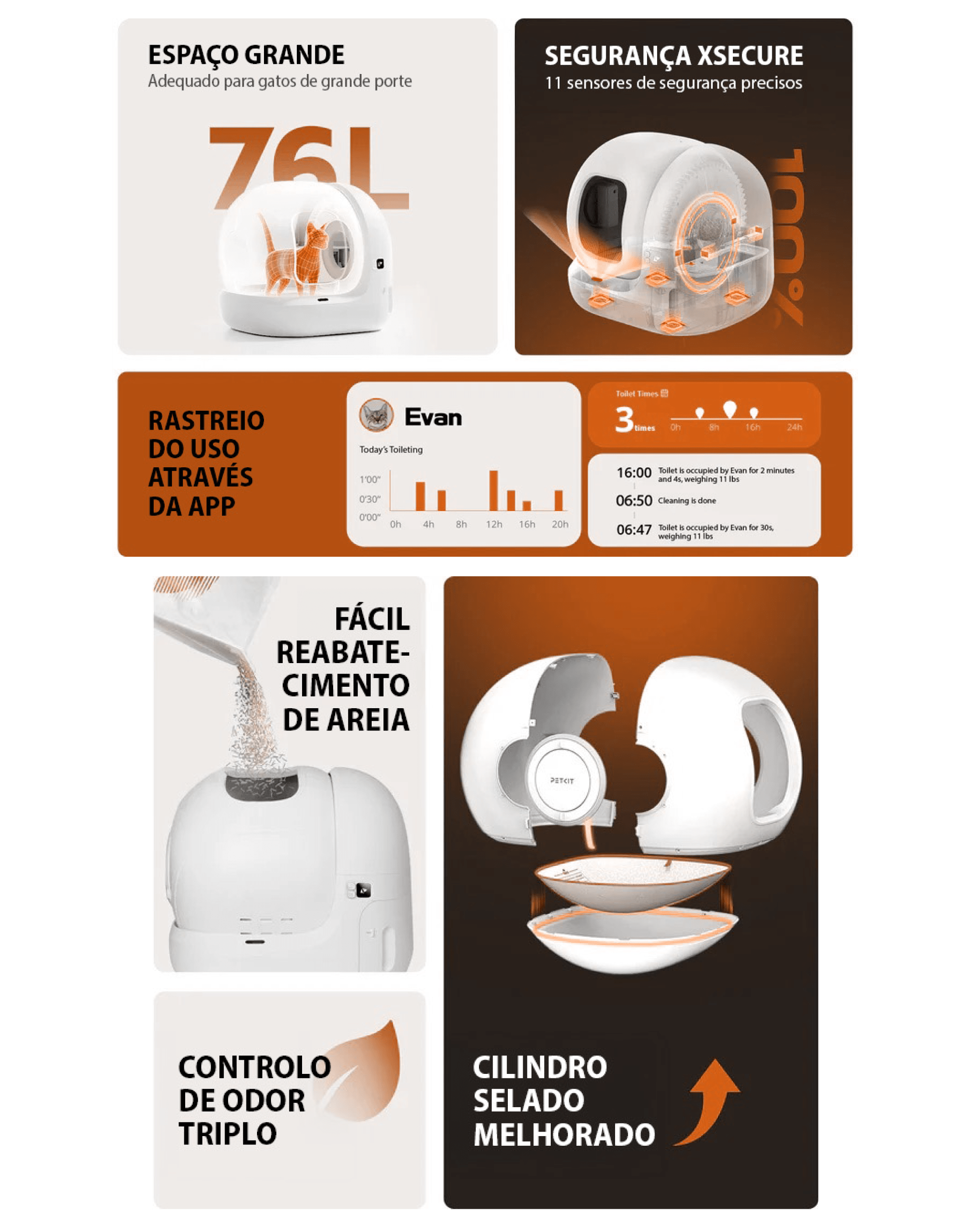 Caixa Sanitária Automática Para gatos de até 8 kg e mais de 6 meses Limpeza e Desodorização automática Sistema de Segurança XSecure Controlo pela APP Petkit Pulverização inteligente Luz LED integrada