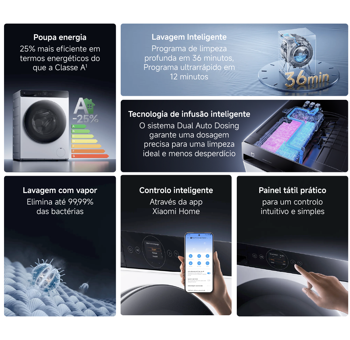 Máquina de Lavar e Secar Roupa Capacidade de 9 kg para lavagem e até 6 kg para secagem Programa Smart Wash de 36 minutos para limpeza rápida e eficaz Função de auto-limpeza para tambor e gaveta de detergente Ciclo rápido de 12 minutos ideal para pequenas cargas Tambor de grande diâmetro (525 mm) Função de vapor antibacteriana Motor Direct Drive silencioso Ligação Smart Wi-Fi