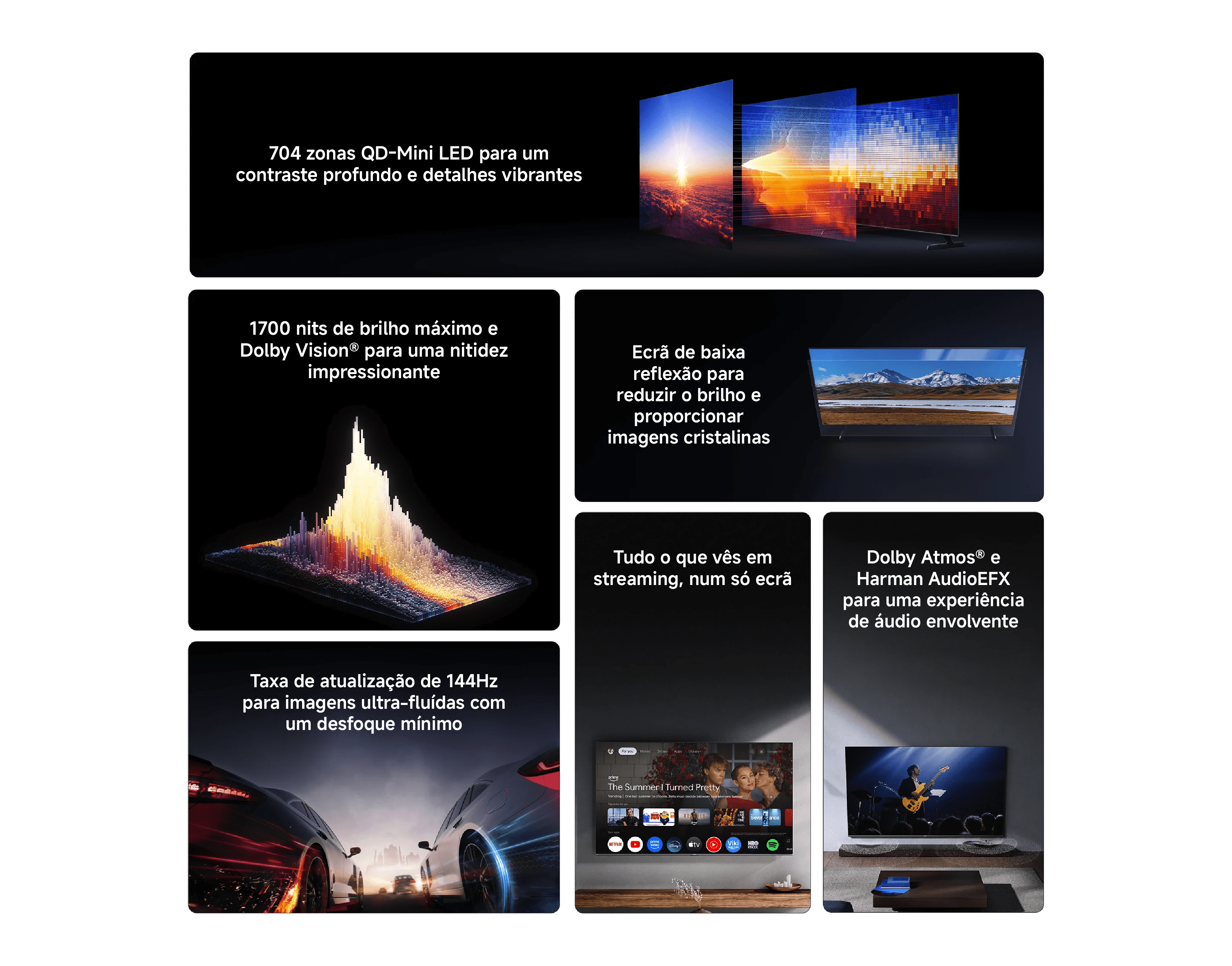 75’’ 4K UHD Resolução: 3840 × 2160 Taxa de atualização: 144Hz Profundidade de cor: 1,07 mil milhões (8bit+FRC) Gama de cores: DCI-P3 92% (mín.) / 94% (típico) Ângulo de visão: 178° (H) / 178° (V) Dolby Vision / HDR10+ / Imax Enhanced / FreeSync / Modo Filmmaker