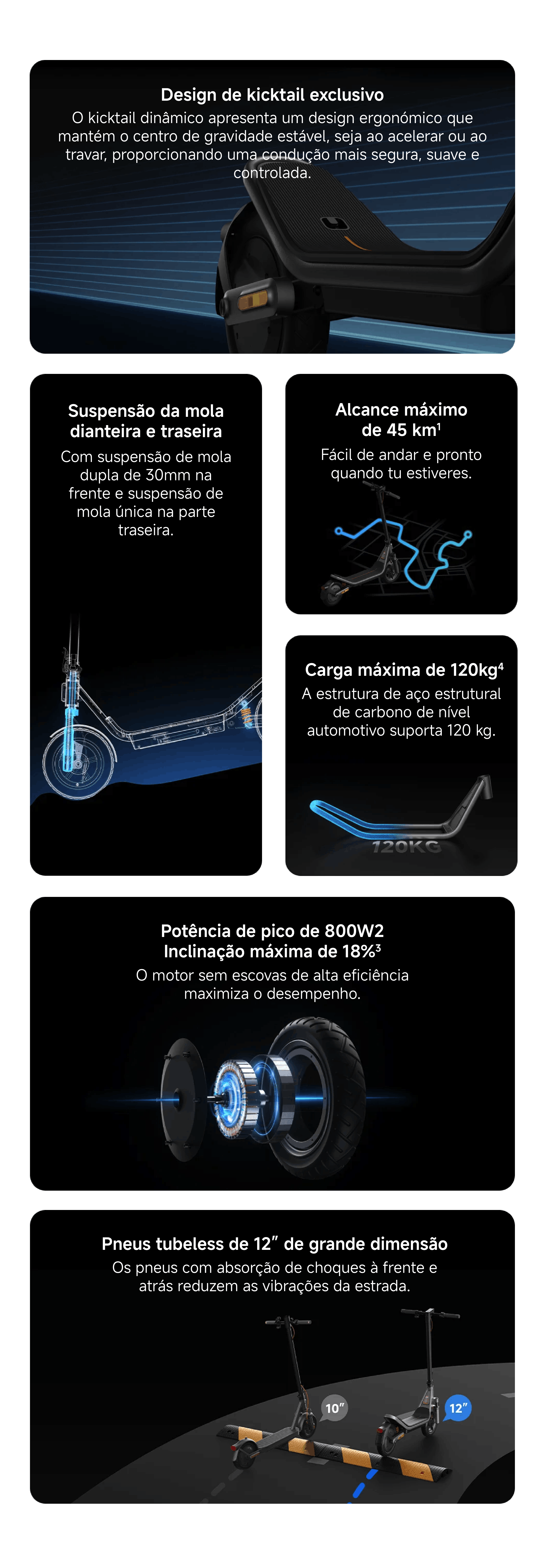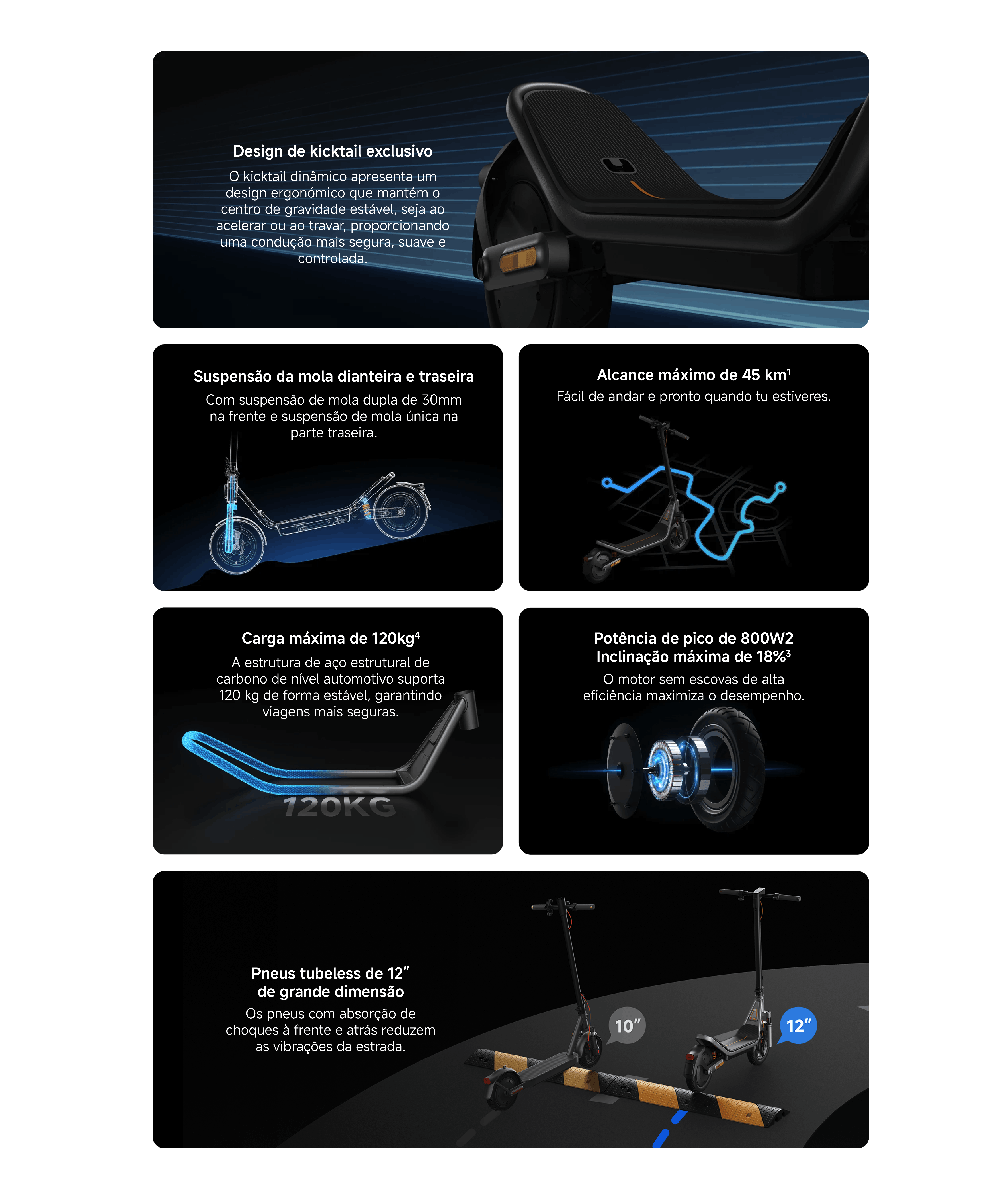 Testado com uma amostra totalmente carregada, a uma temperatura ambiente de 25±5°C e velocidade máxima do vento ≤3 m/s, numa estrada plana e fechada em asfalto ou betão, com inclinação máxima de 5%, peso total (condutor + carga) de 75 kg e a uma velocidade constante de 15 km/h. Quando a bateria fica demasiado fraca para manter a velocidade especificada, a trotinete continua à velocidade máxima possível até que a bateria deixe de permitir o funcionamento.